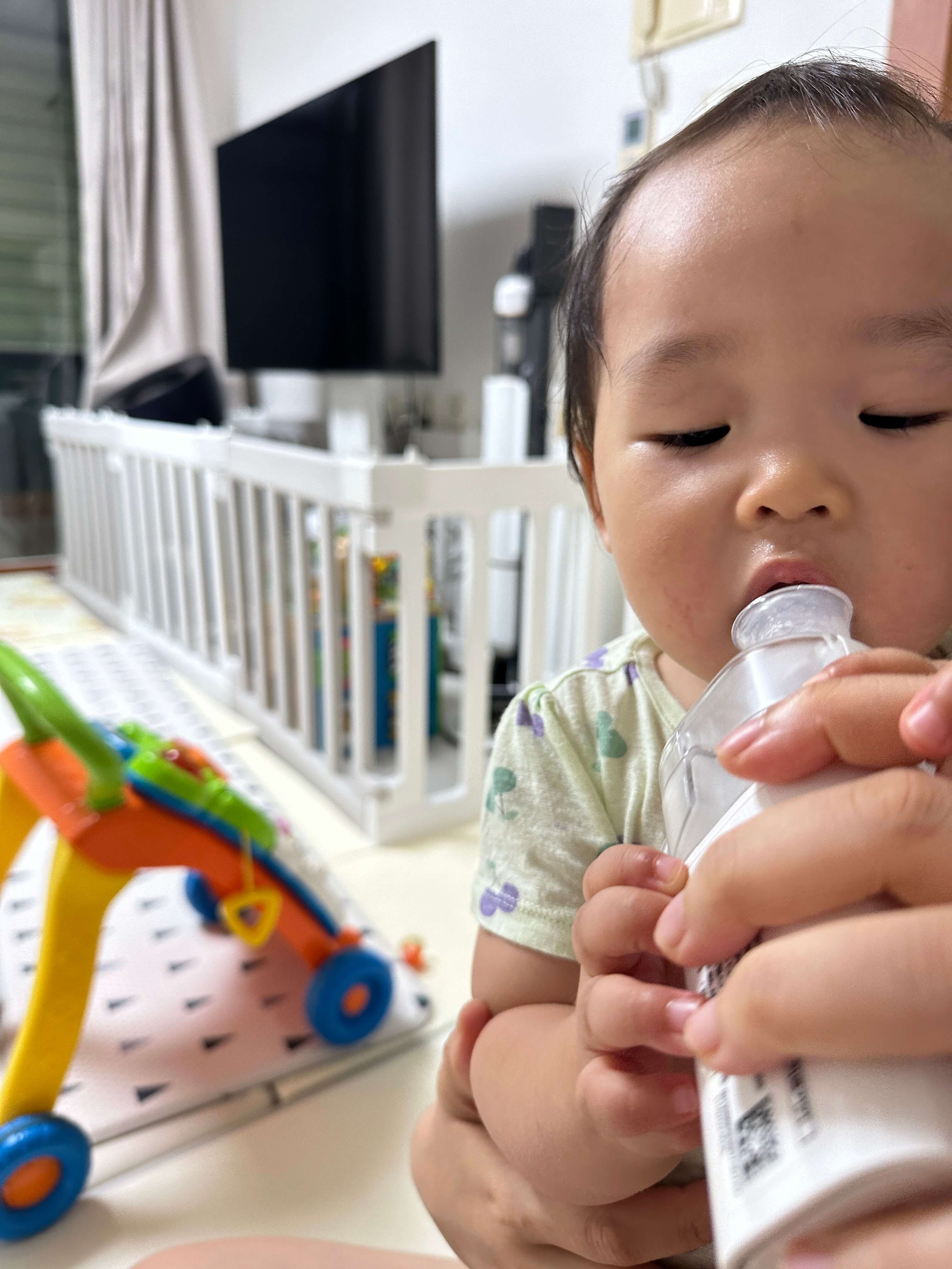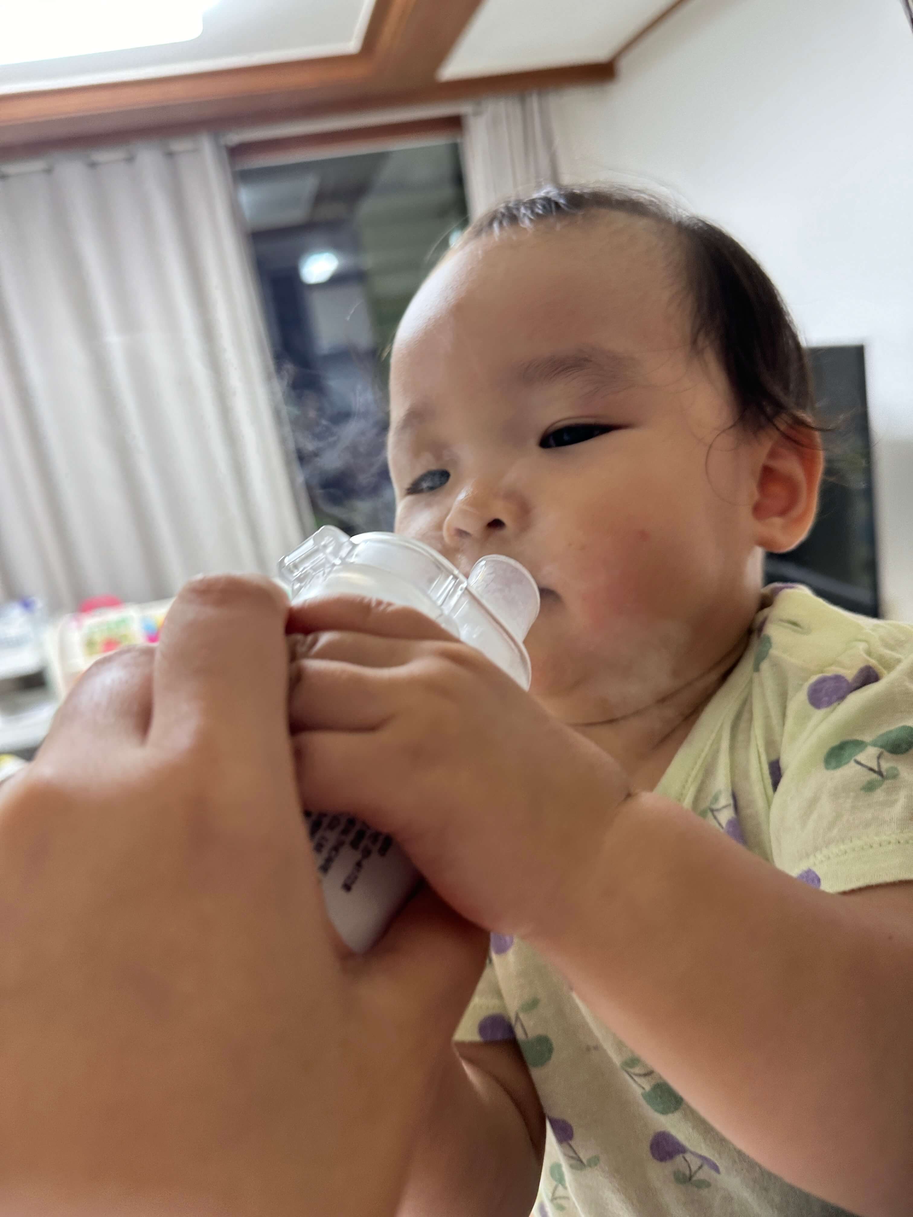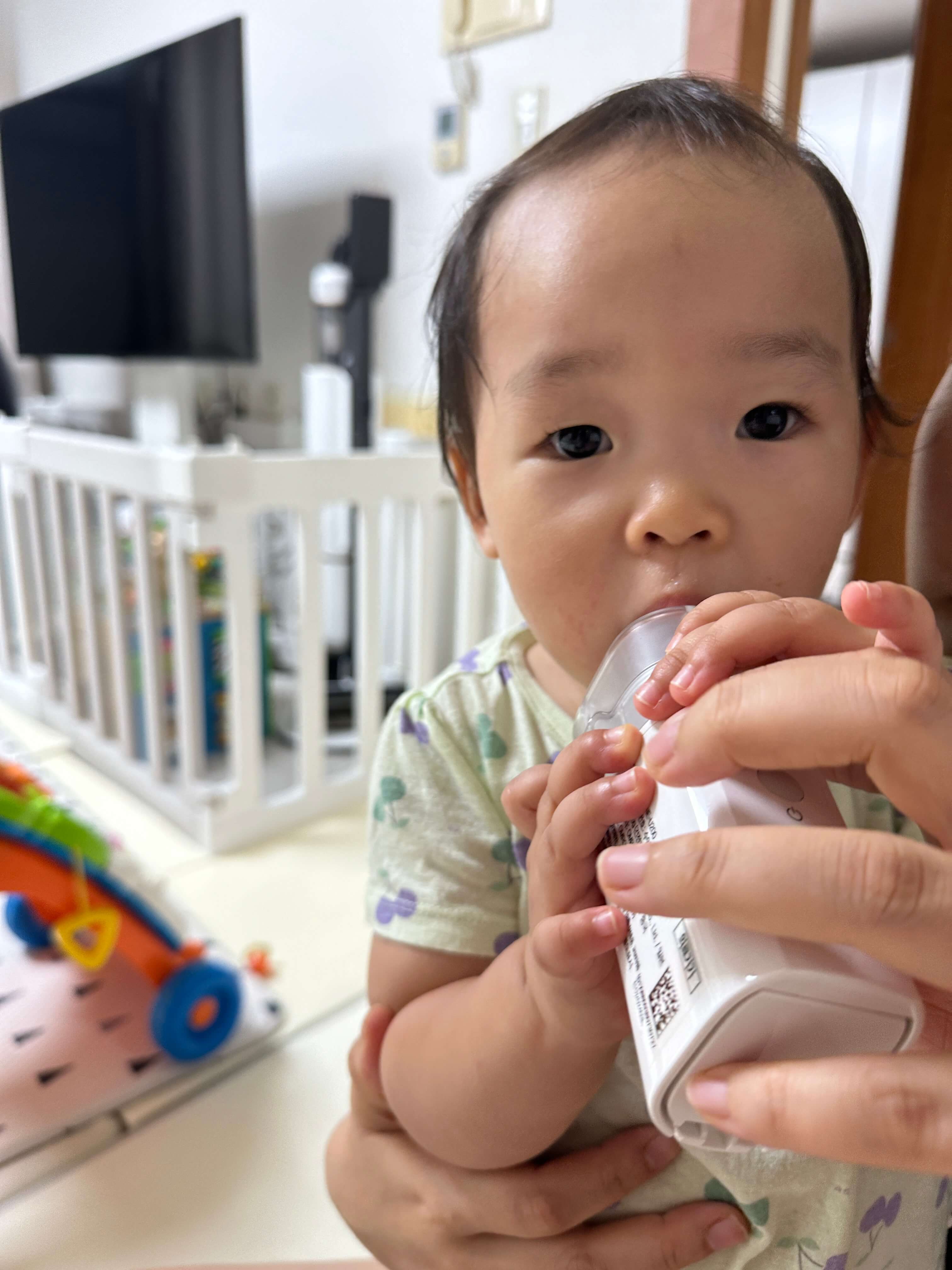 제품 구매 시 함께 제공된 밴드형 마스크는 아기가 거부했지만, 마우스피스는 잘 물고 있더라고요. 아직 젖꼭지를 물고 자는 습관이 있어서 그런지 입에 무언가를 물고 있는 것을 불편해하지 않았던 것 같습니다. 집중력이 짧은 아기라 네블라이저 사용을 오래 하기는 어려웠지만, 부모가 먼저 사용하는 모습을 보여주면서 자연스럽게 적응하도록 도왔습니다.