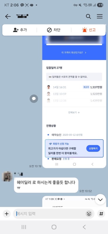 기존 헤이딜러를 통해서 팔아본 경험으로 헤이딜러의 경우 각 중고차 사장님들의 견적금액을 실시간으로 확인할 수 있어 최종 내 매입가격에 대해서 어느정도 산정을 할 수 있고 신뢰가 갔습니다.