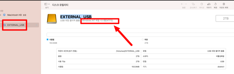1.왼쪽 섹션에 외장 하드가 인식이 되면 외장하드가 어떤 포맷 방식인지 화살표 방향에서 확인이 가능합니다.