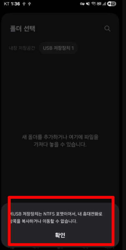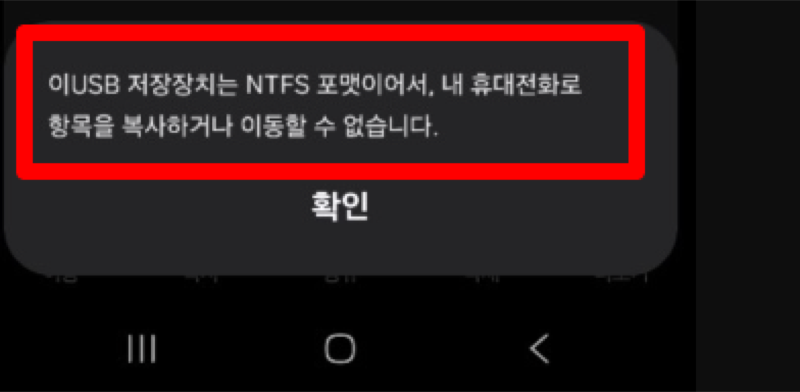 이 USB 저장장치는 NTFS 포맷이어서, 내 휴대전화로 항목을 복사하거나 이동할 수 없습니다.